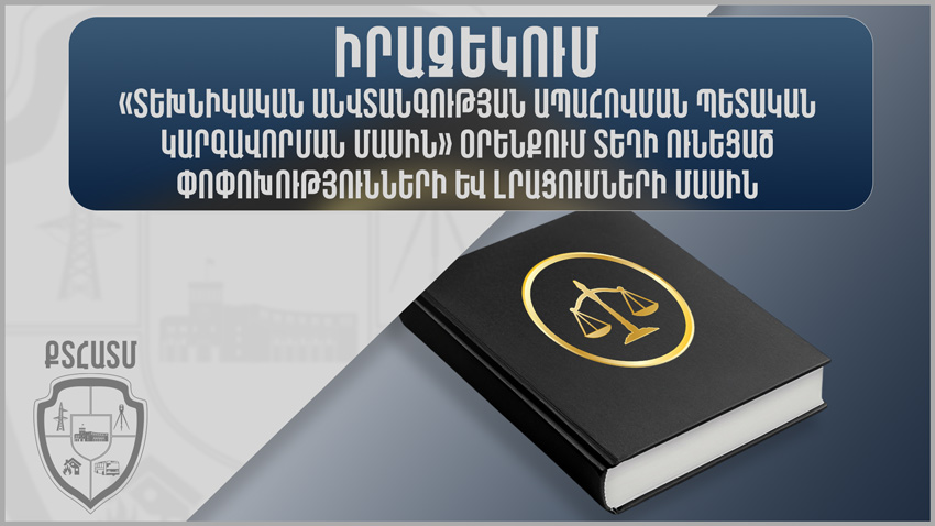 Հարգելի՛ տնտեսավարողներ, ՀՀ քաղաքաշինության, տեխնիկական և հրդեհային անվտանգության տեսչական մարմինը (այսուհետ՝ Տեսչական մարմին) հարկ է համարում ևս մեկ անգամ տեղեկացնել, որ «Տեխնիկական անվտանգության ապահովման պետական կարգավորման մասին» օրենքում կատարվել են հետև