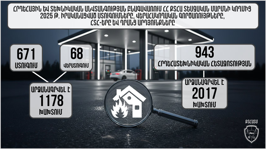 2025 թվականին Տեսչական մարմնի կողմից կայացվել է 7047 որոշում: Նշանակվել է ընդհանուր առմամբ 2.010.640.000 դրամի չափով վարչական տուգանք։ 2025 թվականի ընթացքում ՀՀ պետական բյուջե է գանձվել 502.864.000 դրամ։ ՏԵԽՆԻԿԱԿԱՆ ԵՎ ՀՐԴԵՀԱՅԻՆ ԱՆՎՏԱՆԳՈՒԹՅԱՆ ԲՆԱԳԱՎԱՌՀաշվետու ժամանակահատվածում կա