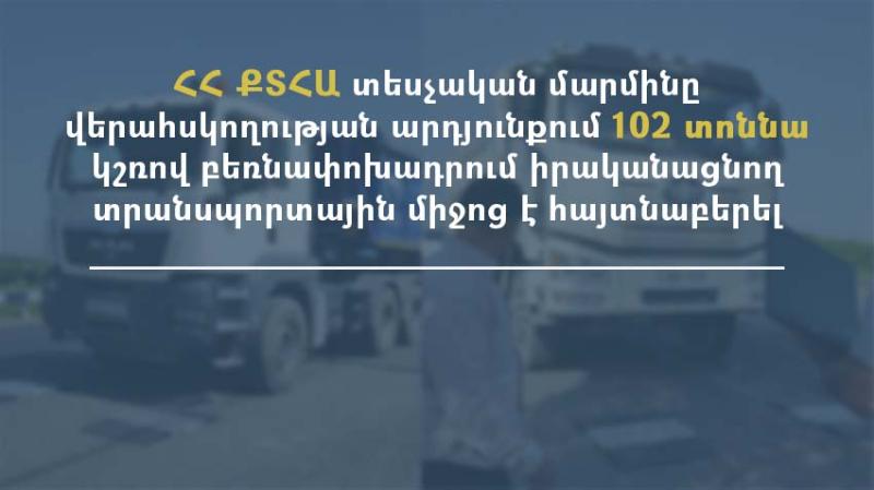 ՀՀ ՔՏՀԱ տեսչական մարմինը վերահսկողության արդյունքում 𝟏𝟎𝟐 տոննա կշռով բեռնափոխադրում իրականացնող ավտոտրանսպորտային միջոց է հայտնաբերել ՀՀ քաղաքաշինության, տեխնիկական և հրդեհային անվտանգության տեսչական մարմինը շարունակում է խիստ վերահսկողությունը