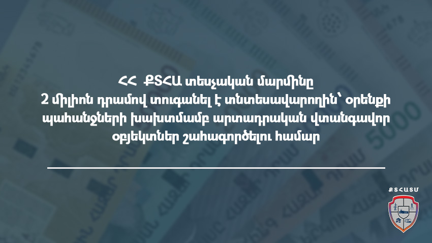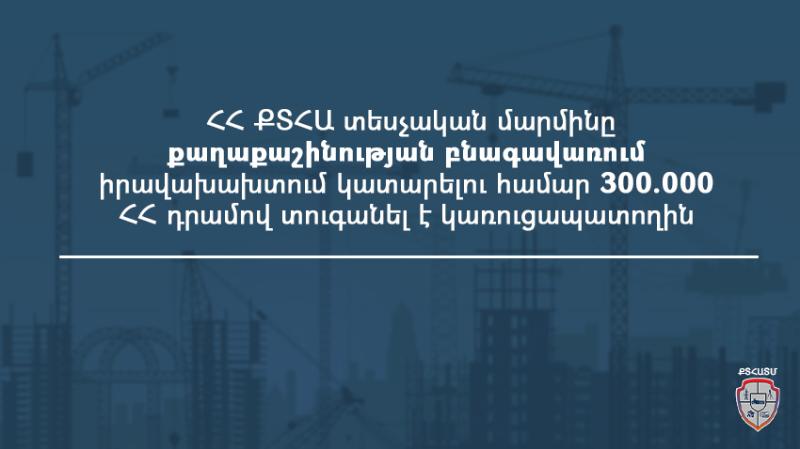 ՀՀ քաղաքաշինության, տեխնիկական և հրդեհային անվտանգության տեսչական մարմնինը քաղաքաշինության բնագավառում իրավախախտում կատարելու համար վարչական պատասխանատվության է ենթարկել կառուցապատողին։ Երևան քաղաքի Չեխովի փողոց, 20 հասցեում գտնվող ավարտված շինարարական օբյեկտի՝ հ