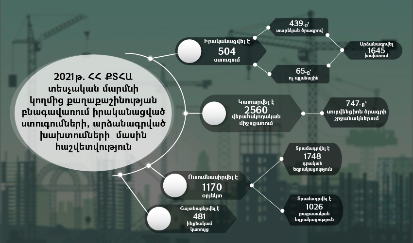 ՀՀ ՔՏՀԱ տեսչական մարմինը քաղաքաշինության բնագավառում 𝟐𝟎𝟐𝟏 թ․ ընթացքում իրականացրել է 𝟓𝟎𝟒 ստուգում, որից 𝟒𝟑𝟗-ը՝ տարեկան ծրագրով, 𝟔𝟓-ը՝ ոչ պլանային։Իրականացված 𝟓𝟎𝟒 ստուգումից 𝟏𝟕𝟔-ն արվել է Երևանում, 𝟕𝟏-ը՝ Կոտայքի, 𝟑𝟖-ը՝ Սյունիքի, 𝟑𝟓-ական՝ Արագածոտն