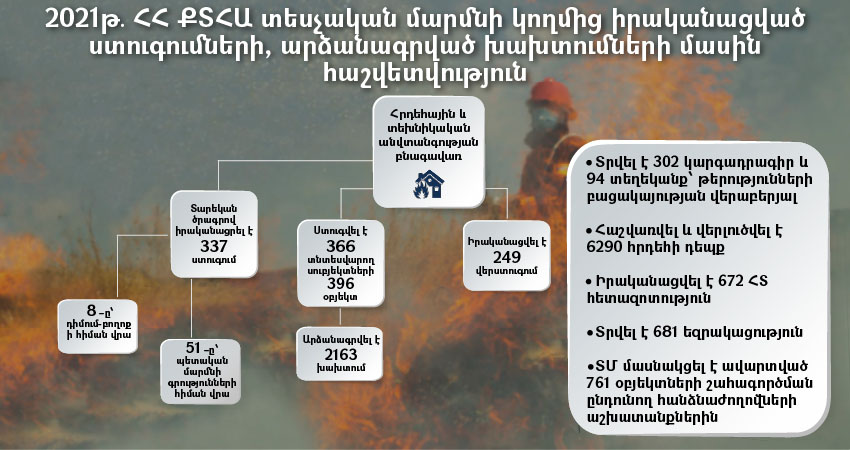 ՀՀ քաղաքաշինության, տեխնիկական և հրդեհային անվտանգության տեսչական մարմնի 𝟐𝟎𝟐𝟏 թ․ ընթացքում գործունեության տարեկան ծրագրով հրդեհային և տեխնիկական անվտանգության բնագավառում իրականացրել է 𝟑𝟑𝟕 ստուգում, ևս 𝟖 ստուգում իրականացվել է հանրությունից ստացված դիմում-բո