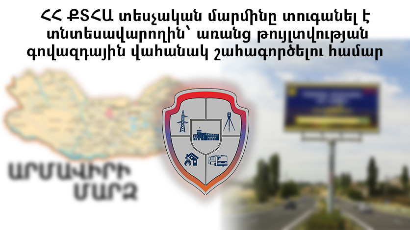 ՀՀ քաղաքաշինության, տեխնիկական և հրդեհային անվտանգության տեսչական մարմնի Արմավիրի տարածքային բաժինը ընդհանուր օգտագործման պետական ավտոմոբիլային ճանապարհներին գովազդի մասին օրենսդրության պահանջների պահպանման նկատմամբ վերահսկողական գործառույթի իրականացման արդյունքում հայտնաբերել է, որ «Իմիջ Մ․ Գ․» ՍՊ ընկերության ղեկավար Ա.Կ.-ն Մ–5 միջպետական նշանակության ավտոմոբիլային ճանապարհի 42+400 կմ հատվածի մայրուղու կենտրոն հատվածում առանց համապատասխան թույլտվության տեղադրել է գովազդային վահանակ։ Դրանով խախտվել է «Ավտոմոբիլային ճանապարհների մասին» ՀՀ օրենքի 14-րդ հոդվածի 2-րդ մասի պահանջը, ըստ որի ավտոմոբիլային ճանապարհի օտարման շերտում և պաշտպանական գոտում սպասարկման օբյեկտների և գովազդի տեղադրումը կատարվում է շինարարական նորմերին և այլ իրավական ակտերով սահմանված պահանջներին համապատասխան' դրանց տնօրինողների թույլտվությամբ: