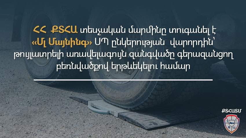 ՀՀ քաղաքաքաշինության, հրդեհային և տեխնիկական անվտանգության տեսչական մարմնի Արմավիրի տարածքային բաժնի մասնագետները վերահսկողության արդյունքում հայտնաբերել են, որ «Մլ Մայնինգ» ՍՊ ընկերության վարորդ Ս․Մ․-ն ՀՀ Մ-5 Երևան-Արմավիր-Թուրքիայի Հանրապետության սահման միջպետական նշանակության ավտոմոբիլային ճանապարհի 17 կմ հատվածում երթևեկել է թույլատրելի առավելագույն զանգվածը մոտ 17 հազար կիլոգրամով (17 տոննա) գերազանցող, 4 սռնի ունեցող բեռնատարով։