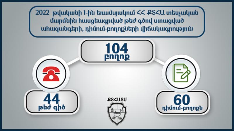 Տեխնիկական և հրդեհային անվտանգության բնագավառում հանրությունից ստացվել է 𝟏𝟒 դիմում-բողոք, որից 𝟓-ը՝ թեժ գծով։ 𝟏𝟒 դիմում-բողոքից հիմնավոր է եղել 𝟔-ը։ Հանրությունից ստացված 𝟏 բողոքի հիման վրա իրականացվել է ստուգում: 𝟐𝟎𝟐𝟐 թվականի առաջին եռամսյակի ընթացքում պետական կառավարման և տեղական ինքնակառավարման մարմիններից ստացվել է 𝟓𝟔 գրություն։