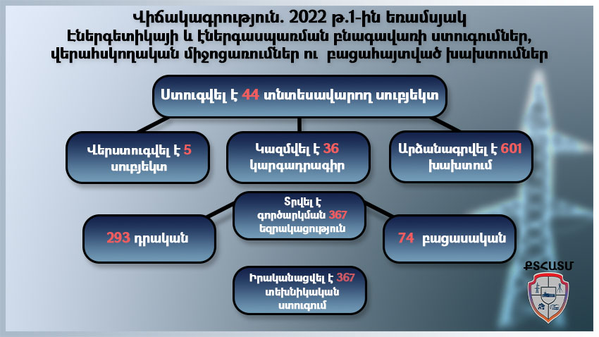 ՀՀ տարածքում տեղակայված 𝟔 կՎ և բարձր լարման էլեկտրաէներգետիկական և միջին ու բարձր ճնշման գազամատակարարման համակարգերում՝ տնտեսվարող սուբյեկտների դիմումների հիման վրա, նոր կառուցված և վերակառուցված էներգատեղակայանքներում իրականացվել է 𝟑𝟔𝟕 տեխնիկական ստուգում, որից 𝟐𝟎𝟔-ը՝ էլեկտրաէներգետիկական, 𝟏𝟔𝟏-ը՝ գազամատակարարման համակարգերում։