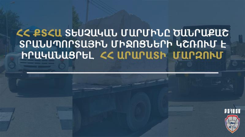 ՀՀ քաղաքաշինության, տեխնիկական և հրդեհային անվտանգության տեսչական մարմինը շարունակում է միջպետական, հանրապետական նշանակության ավտոճանապարհներով ծանրաքաշ և մեծ եզրաչափերով բեռնափոխադրումներ իրականացնող տրանսպորտային միջոցների նկատմամբ վերահսկողության իրականացումը։ Տեսչական մարմինը հուլիսի 11-ին և 12-ին ծանրաքաշ, մեծ եզրաչափերով բեռնափոխադրումներ իրականացնող տրանսպորտային միջոցների կշռում է իրականացրել Արարատի մարզում։
