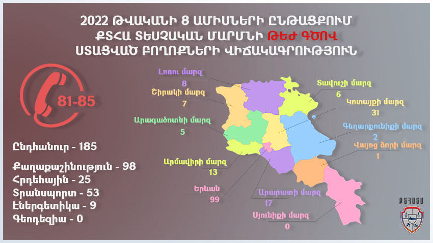 ՀՀ քաղաքաշինության, տեխնիկական և հրդեհային անվտանգության տեսչական մարմին 𝟐𝟎𝟐𝟐 թ-ի հունվար - օգոստոս ամիսների ընթացքում՝ 𝟎𝟔𝟎 𝟖𝟔 𝟔𝟔 𝟔𝟔 /𝟖𝟏-𝟖𝟓 թեժ գծի հեռախոսահամարին գրանցվել է ընհանուր առմամբ 𝟏𝟖𝟓 ահազանգ։
