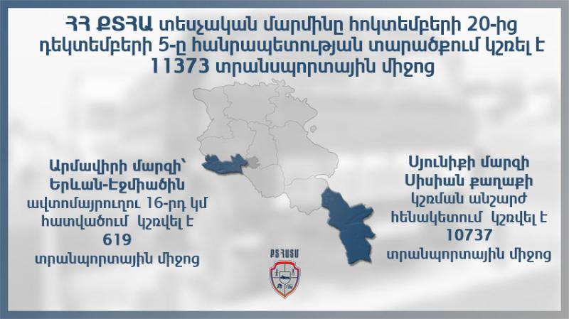 Արմավիրի մարզի, մասնավորապես` Երևան-Էջմիածին ավտոմայրուղու 𝟏𝟔-րդ կմ հատվածում տեղակայված կշռման անշարժ հենակետում կատարվել է 𝟔𝟏𝟗 կշռում, կազմվել է 𝟕𝟏 արձանագրություն։