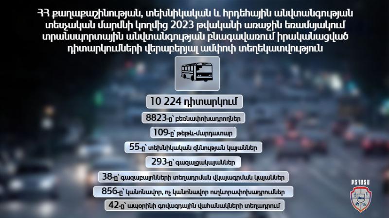 ՀՀ քաղաքաշինության, տեխնիկական և հրդեհային անվտանգության տեսչական մարմնի կողմից 2023 թվականի առաջին եռամսյակում տրանսպորտային անվտանգության բնագավառում իրականացրել է 10 224 դիտարկում,