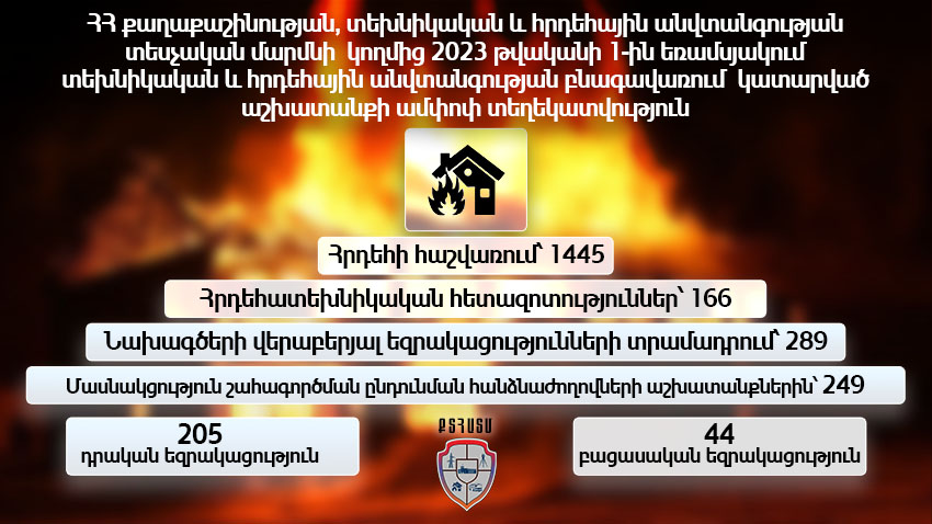 ՀՀ քաղաքաշինության, տեխնիկական և հրդեհային անվտանգության տեսչական մարմնի կողմից 𝟐𝟎𝟐𝟑 թվականի 𝟏-ին եռամսյակում տեխնիկական և հրդեհային անվտանգության բնագավառում կատարվել են հետևյալ աշխատանքները․