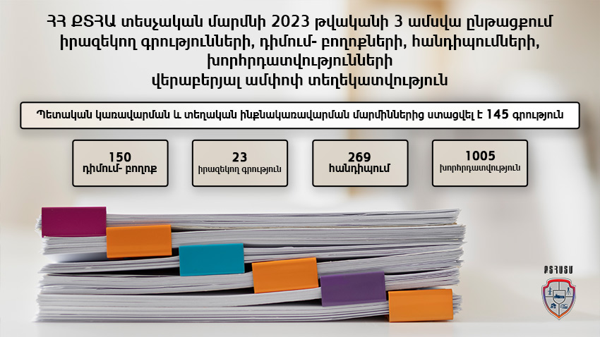 ՀՀ ՔՏՀԱ տեսչական մարմինը 2023 թվականի 3 ամսվա ընթացքում պետական կառավարման և տեղական ինքնակառավարման մարմիններից ստացել է 145 գրություն․