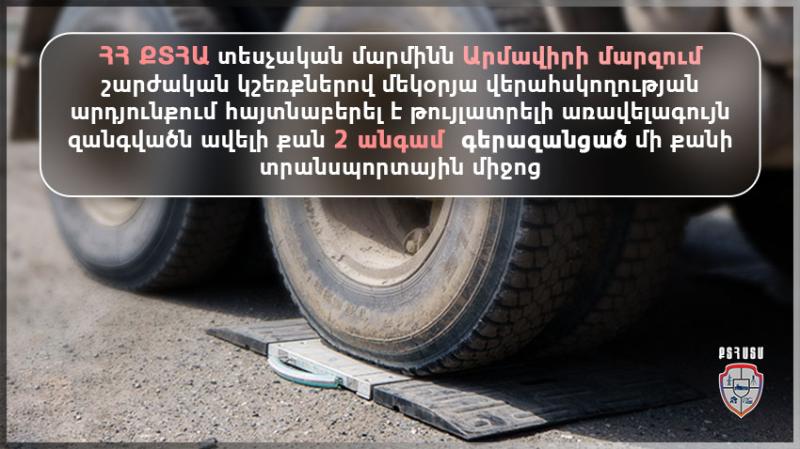 Ըստ այդմ՝ տրանսպորտային անվտանգության վարչության մասնագետների իրականացրած դիտարկումների և վերահսկողության արդյունքում հայտնաբերվել են ՀՀ ավտոմոբիլային ճանապարհներով առավելագույն զանգվածը գերազանցած 7 տրանսպորտային միջոցներ։ Դրանցից 5-ը թույլատրելի 26 և 32 տոննա առավելագույն զանգվածը գերազանցել են 17-27 տոննայով։