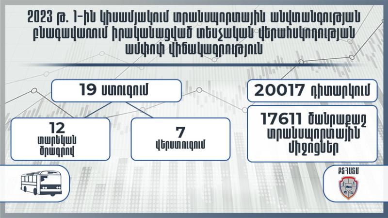 ՀՀ քաղաքաշինության, տեխնիկական և հրդեհային անվտանգության տեսչական մարմինը 𝟐𝟎𝟐𝟑 թ. 𝟏-ին կիսամյակում տրանսպորտային անվտանգության բնագավառում իրականացրել է 𝟏𝟗 ստուգում, որից 𝟏𝟐-ը՝ տարեկան ծրագրով, 𝟕-ը՝ վերստուգում։