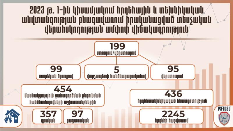 ՀՀ քաղաքաշինության, տեխնիկական և հրդեհային անվտանգության տեսչական մարմինը 𝟐𝟎𝟐𝟑 թ. 𝟏-ին կիսամյակում հրդեհային և տեխնիկական անվտանգության բնագավառում իրականացրել է 𝟏𝟗𝟗 ստուգում/վերստուգում, որից 𝟗𝟗-ը՝ տարեկան ծրագրով, 𝟓-ը՝ վարչապետի հանձնարարականով, 𝟗𝟓՝-ը վերստուգում։