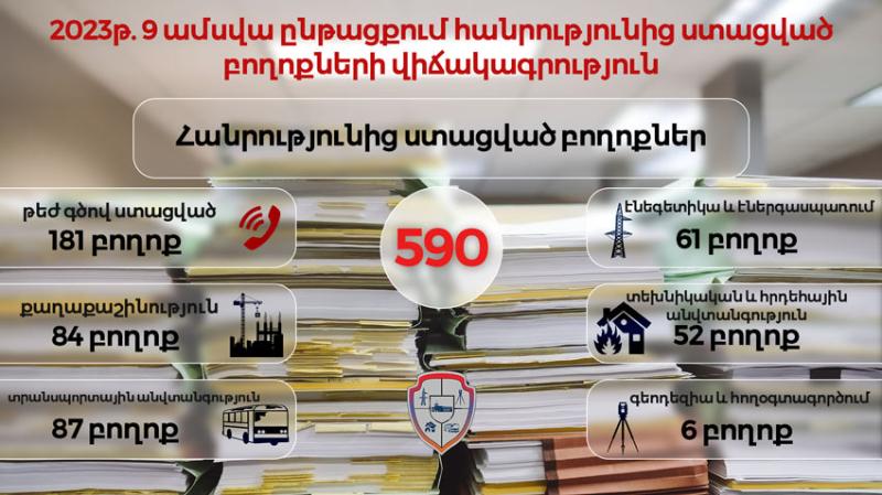 𝟐𝟎𝟐𝟑թ․ 𝟗 ամսվա ընթացքում ՀՀ քաղաքաշինության, տեխնիկական և հրդեհային անվտանգության տեսչական մարմինը հանրությունից ստացել է 𝟓𝟗𝟎 բողոք, որից 𝟑𝟖𝟒-ը վերաբերել է քաղաքաշինության, 𝟖𝟕-ը՝ տրանսպորտային անվտանգության, 𝟔𝟏-ը՝ էներգետիկայի և էներգասպառման, 𝟓𝟐-ը՝ տեխնիկական և հրդեհային անվտանգության, 𝟔-ը՝ գեոդեզիայի և հողօգտագործման բնագավառին։