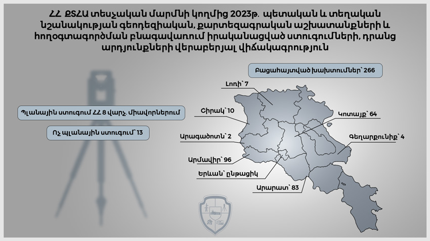 2023 թվականին իրականացված ստուգումների արդյունքում բացահայտված 266 խախտումներից 96-ը արձանագրվել է Արմավիրի, 83-ը՝ Արարատի, 64-ը՝ Կոտայքի, 10-ը ՝ Շիրակի, 7-ը՝ Լոռու, 4-ը՝ Գեղարքունիքի և 2-ը՝ Արագածոտնի մարզերում։ Արձանագրված 266 խախտումներից 112-ը բացահայտվել է Տարեկան ծրագրի շրջանակներում իրականացված ստուգումների ժամանակ։