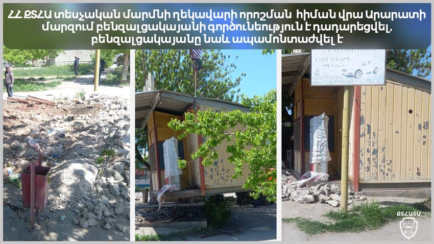 Հաշվի առնելով խախտումների ռիսկայնությունն ու վտանգավորության աստիճանը՝ ՀՀ ՔՏՀԱ տեսչական մարմնի ղեկավարը բենզալցակայանի գործունեությունը դադարեցնելու որոշում է կայացրել։