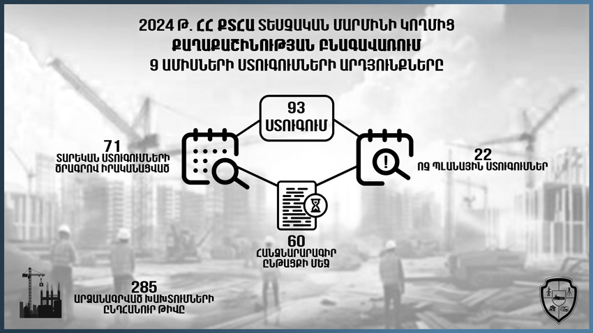 Քաղաքաշինության բնագավառում 2024 թվականի ստուգումների տարեկան ծրագրով 9 ամսվա ընթացքում նախատեսված 200 ստուգումներից իրականացվել է 71-ը։ Միևնույն ժամանակ, 67 օբյեկտ չի ստուգվել՝ շինարարական աշխատանքների բացակայության, ավարտական ակտերի, շինարարական աշխատանքներն ավարտված լինելու (2 օբյեկտ) պատճառով։