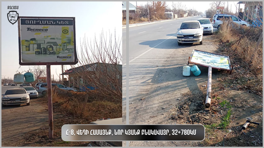 Տեսչական մարմնի մշտադիտարկումների ընթացքում արձանագրվել է, որ մի շարք վայրերում գովազդային վահանակներն ու ցուցանակները տեղադրված են առանց համապատասխան թույլտվության՝ խախտելով «Ավտոմոբիլային ճանապարհների մասին» ՀՀ օրենքի 14-րդ հոդվածի 2-րդ մասի պահանջները։ Խախտումները հայտնաբերվել են ՀՀ Արարատի մարզի հետևյալ հատվածներում.