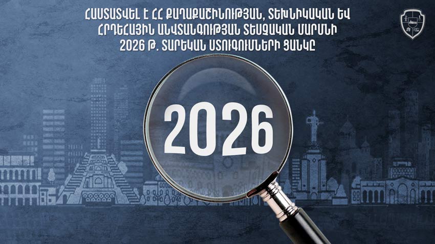 Ձեզ ենք ներկայացնում 𝟐𝟎𝟐6 թ․-ին՝ Էներգետիկայի, տրանսպորտի, տեխնիկական և հրդեհային անվտանգության, քաղաքաշինության, հողերի օգտագործման և պահպանման բնագավառներում ՀՀ քաղաքաշինության, տեխնիկական և հրդեհային անվտանգության տեսչական մարմնի ստուգումների տարեկան ծրագրում ներառված ստուգման ենթակա սուբյեկտների (օբյեկտներ) ցանկը։